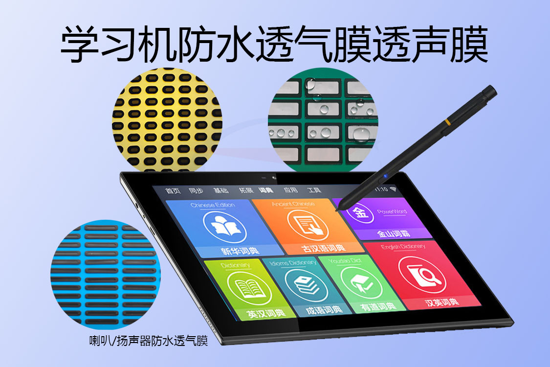 一般來說,學(xué)習(xí)機(jī)做防水基本上在兩個(gè)方面,一是外殼結(jié)構(gòu)的防水(比如說上下殼體與TP觸摸屏與殼體屏幕框體等),二是電聲器件或者說電聲器件對(duì)應(yīng)的殼體透聲孔部位的防水,更進(jìn)一步的是對(duì)于PCB電路板也做防水,對(duì)于外殼結(jié)構(gòu)防水一般是采用防水密封圈或者采用防水密封膠點(diǎn)膠加工工藝來實(shí)現(xiàn)防水,對(duì)于電聲器件的防水,一般是在電聲器件對(duì)應(yīng)的透氣孔透聲孔部位安裝學(xué)習(xí)機(jī)防水透氣膜透聲膜來實(shí)現(xiàn)防水透氣透聲的,如果對(duì)于電路板的防水則是通過納米防水材料涂覆實(shí)現(xiàn)的。薄弱的環(huán)節(jié)在于學(xué)習(xí)機(jī)防水透氣膜透聲膜上,在學(xué)習(xí)機(jī)防水透氣膜透聲膜滿足防水標(biāo)準(zhǔn)并實(shí)測(cè)通過后,也就是說薄弱的學(xué)習(xí)機(jī)防水透氣膜透聲膜環(huán)節(jié)通過了,就說明學(xué)習(xí)機(jī)整機(jī)也是符合相應(yīng)的防水要求的。