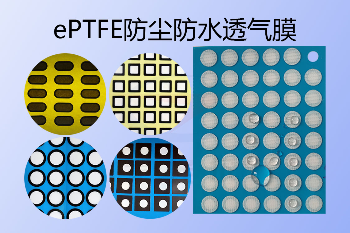 ePTFE防塵防水膜一般是安裝在電子電器產品的相應的透氣孔上,基本都是采用的背膠形式的防水透氣膜廠家模切加工產品,防塵防水膜貼附在透氣孔上就可以很好的實現防塵防水透氣,通過良好的透氣性能,還能實現內外壓力平衡,ePTFE防塵防水膜采用的是膨體聚四氟乙烯材料,這種材料本身是擁有無數個均勻分布的微孔的,由于微孔孔徑遠小于因為相互作用力形成的水滴粒徑,并且也遠小于灰塵等顆粒物粒徑,因此水和灰塵等不能通過就會被隔絕在膜外,實現了很好的防塵防水;再者ePTFE防塵防水膜的微孔孔徑相比空氣中的氣體分子粒徑是大的多的,因此氣體分子是可以自由出入的,進而實現了電子電器內外壓力平衡。