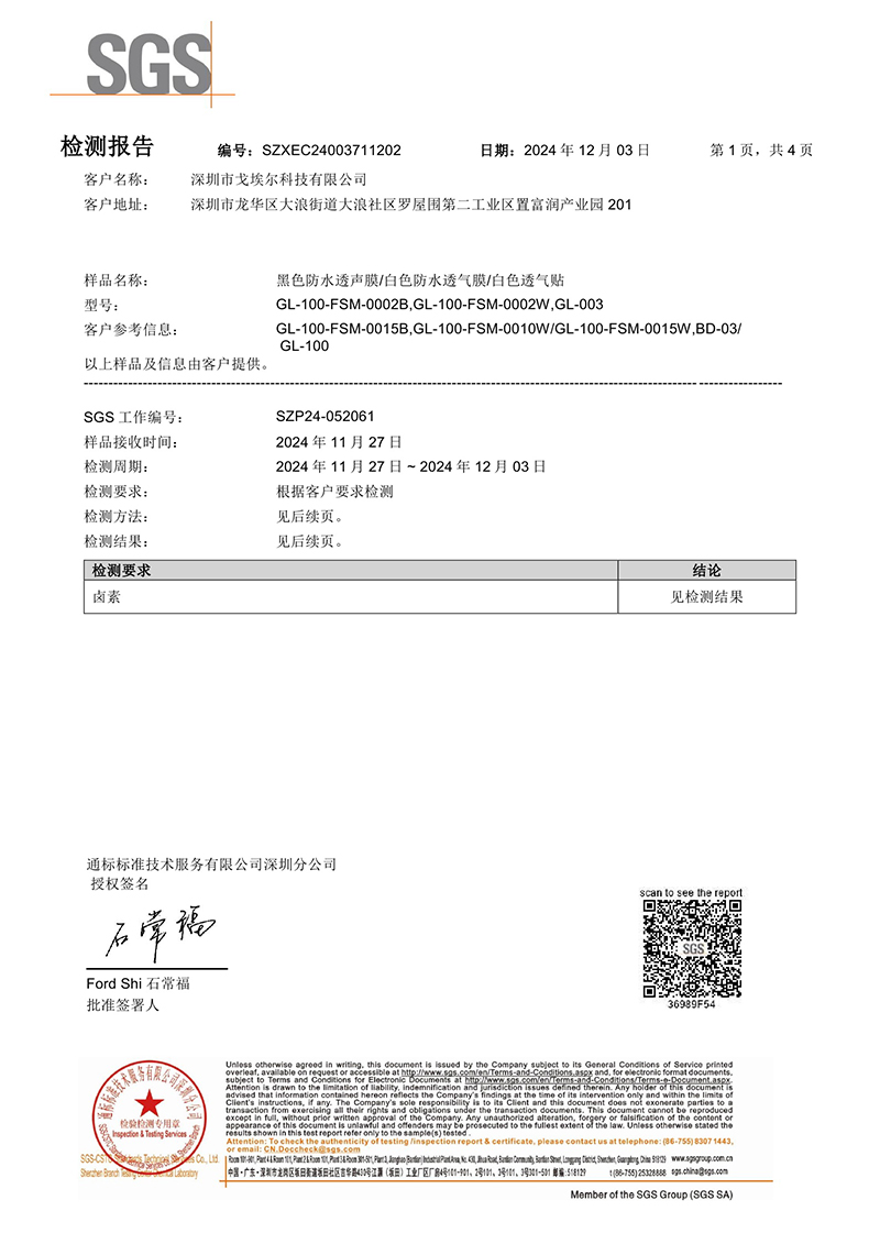 黑色防水透聲膜/白色防水透氣默默/白色透氣貼SGS檢測報告